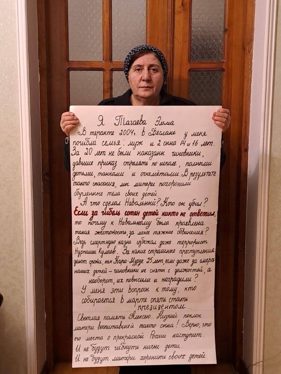 As a result of the terrorist attack in Beslan in 2004, Tagaeva lost her husband and two sons, 14 and 16 years old. In her address, she emphasizes that this happened, among other things, due to the fault of Russian officials, who gave the order to storm the school with hostages.