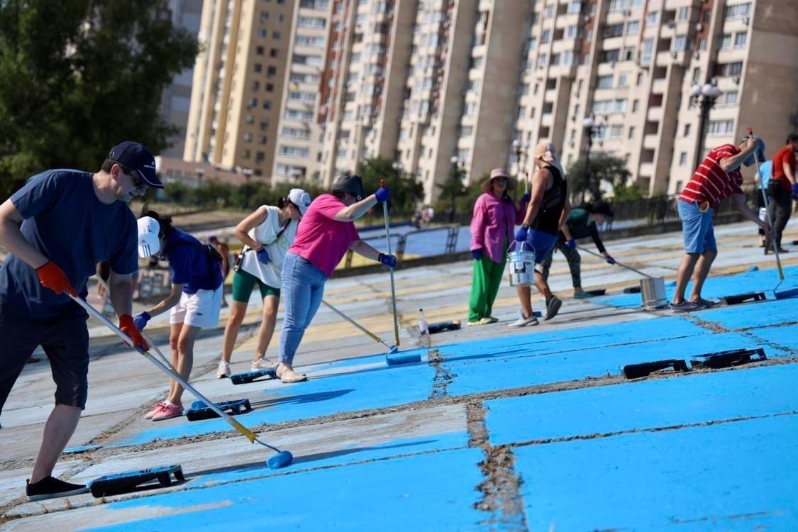 Before the International Day of the World's Indigenous Peoples on Obolonskaya Embankment in Kyiv, activists restored the Crimean Tatar flag on concrete slabs near the Dnieper.