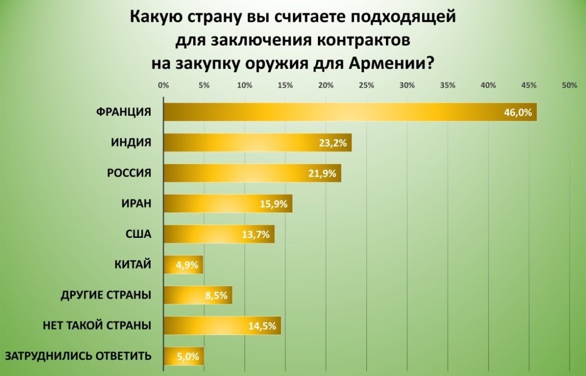 46% of the Armenian population surveyed believes that the most suitable country for purchasing weapons is France. India is in second place in this regard (23.2%), and the Russian Federation is in third (21.9%). These are data from the research company Gallup.