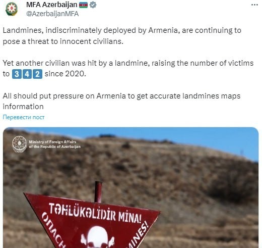 Число жертв мин в Карабахе достигло 342 человек. Все должны оказать давление на Армению, чтобы получить точную информацию о картах наземных мин. Об этом говорится в публикации МИД Азербайджана.
