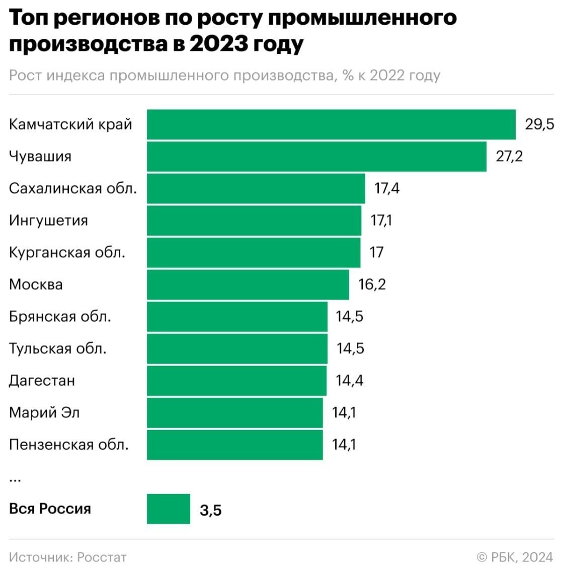 Лидеры года в России – Камчатский край (+29,5%), Чувашия (+27,2%) и Сахалинская область (+17,4%). Согласно данным Росстата, в большинстве регионов РФ рост промышленного производства в 2023 году оказался выше среднего показателя по стране (3,5%). Из 85 регионов 21 показал отрицательную динамику роста производства. Хуже всего ситуация в Приморском крае (-11,6%).