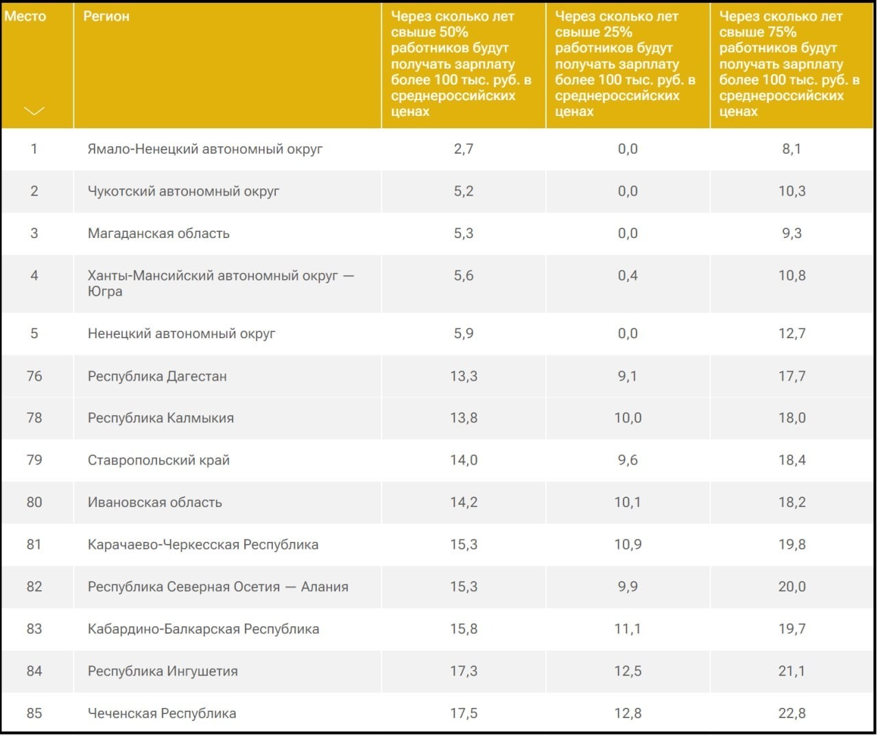 На 84-м месте расположена Ингушетия (медианная з/п в 100 тыс. рублей возможна через 17,3 года), на 83-м месте — Кабардино-Балкария (15,8 года), 82-е и 81-е места делят Северная Осетия и Карачаево-Черкесия (15,3 года), на 79-м – Ставропольский край (14 лет), на 76-м — Дагестан (13,3 года).