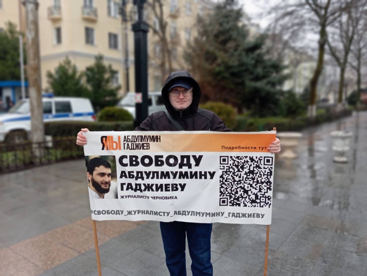 Сегодня в Махачкале состоялся очередной пикет в поддержку политзаключенного-журналиста Абдулмумина Гаджиева. На акции присутствовали заместитель главного редактора издания «Черновик» Магомед Магомедов и его коллеги.