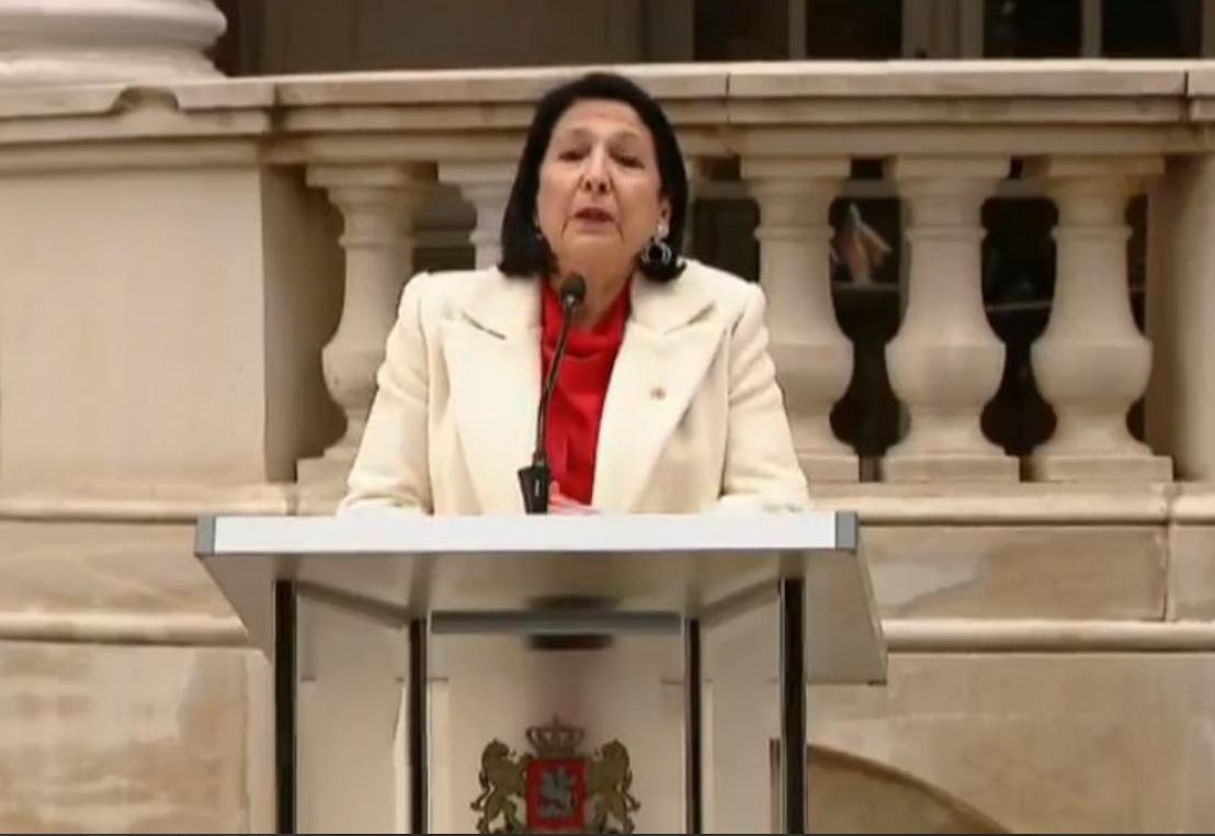 Примечательно, что Зурабишвили сегодня надела тот самый бело-красный костюм, в котором шесть лет назад была на собственной инаугурации.