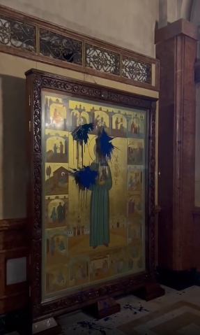 Накануне неизвестные облили краской икону святой Матроны Московской. При этом краской оказалось испорчено лишь место клейма с изображением Сталина. Гражданская активистка Ната Перадзе заявила, что получает сообщения с угрозами после того, как 9 января поделилась на своей странице в Facebook видеокадрами облитой иконы. В свою очередь, лаборатория исследования советского прошлого потребовала убрать изображение Сталина из главного собора Грузии.